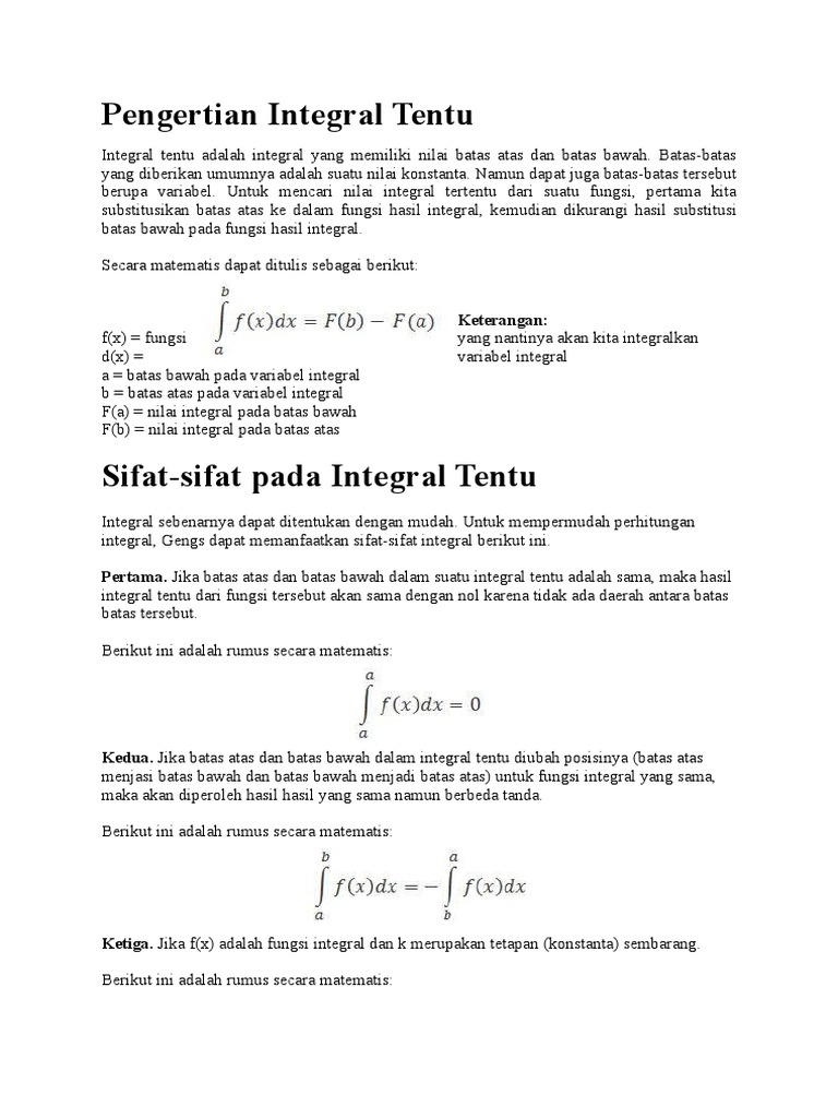 Integral tak tentu (indefinite integral/antiderivatif) merupakan sebuah bentuk operasi pengintegralan pada suatu fungsi yang menghasilkan suatu fungsi integral merupakan suatu konsep penjumlahan secara berkesinambungan dalam matematika. Batas integrasi dapat digunakan variabel sebelum substitusi maupun variabel substitusi. Integral tertentu adalah integral yang memiliki batas. Ajukan pertanyaan tentang tugas sekolahmu.