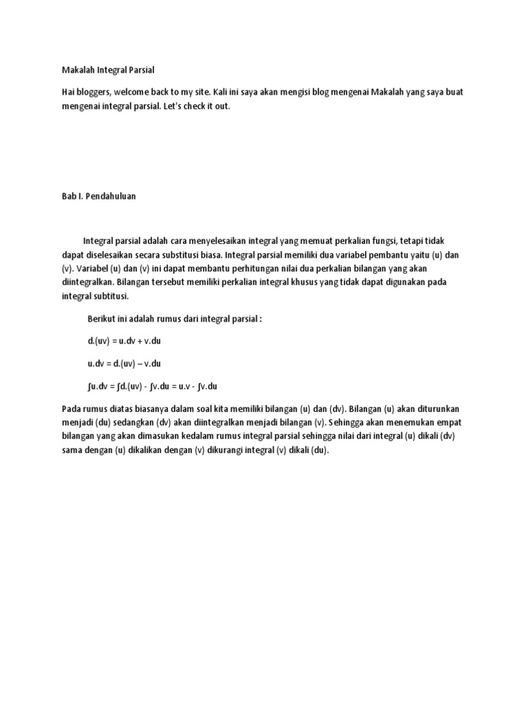 Integral Parsial U/V. Coba perhatikan bagaimana rumus integral parsial diturunkan dari rumus turunan hasil kali dua fungsi sebagai berikut. Teknik integral parsial merupakan salah satu teknik pengintegralan yang digunakan ketika integran tidak dapat diintegralkan hanya dengan definisi integral (antiturunan).