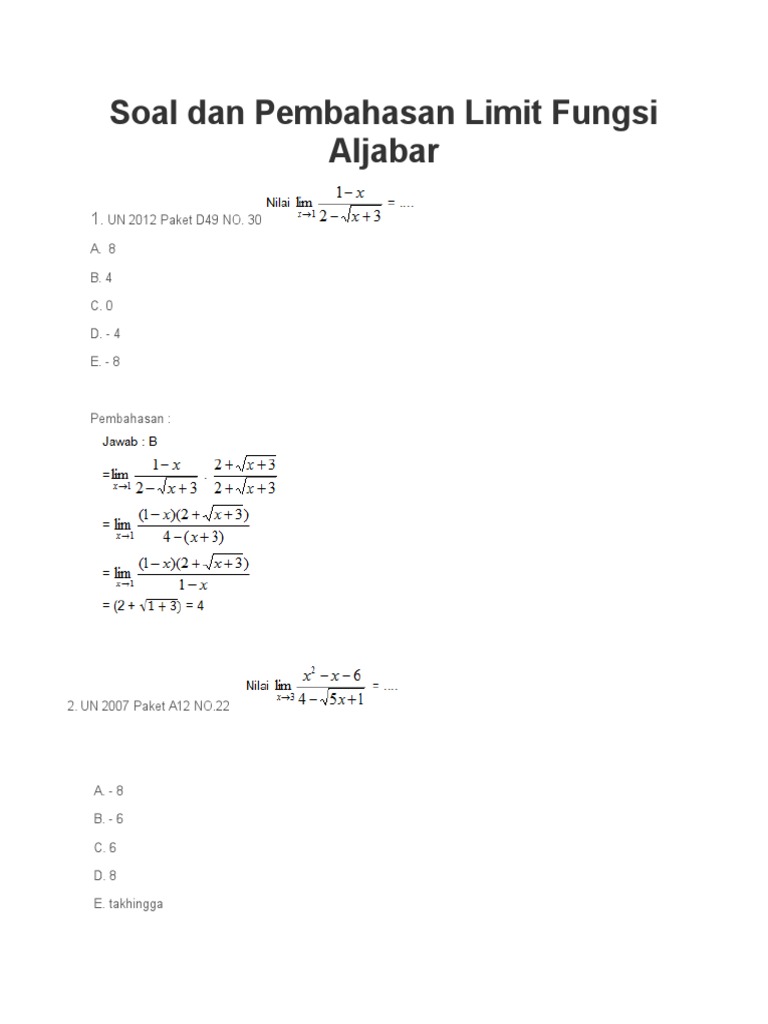 Soal Dan Pembahasan Limit Fungsi from imgv2-1-f.scribdassets.com Bila disubstitusi langsung akan menghasilkan bilangan tidak tentu. Limit konstanta k unk tuk x mendekati a ada dan nilainya sama dengan k, ditulis k = k. Tim soalkimia.com telah merangkum soal dan jawaban terkait materi limit fungsi untuk siswa pelajari dirumah sebagai latihan juga persiapan sebelum mengikuti ulangan.