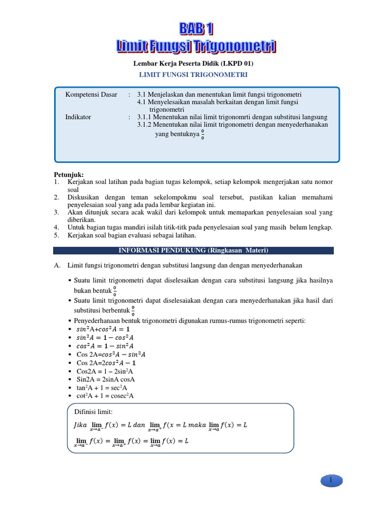 Contoh Soal Limit Fungsi Trigonometri Substitusi Langsung. Limit didalam konsep ilmu matematik biasa digunakan untuk menjelaskan suatu sifat dari suatu fungsi, saat agumen telah mendekati pada suatu titik tak dengan substitusi langsung Berikut ini materi lengkap tentang limit fungsi, mulai dari pengertian, limit fungsi aljabar dan trigonometri, rumus, cara menyelesaikan contoh: