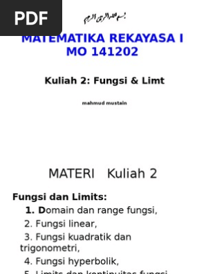 Limit fungsi limit suatu fungsi merupakan salah satu konsep mendasar dalam kalkulus dan analisis, tentang kelakuan suatu 5.