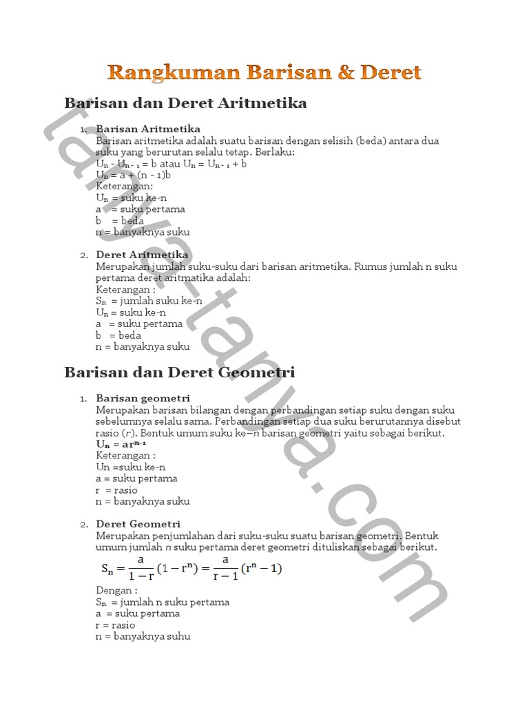 Rumusnya masih blom dimengerti pak,, reading sudah , materi nya alhamdulillah udah setengah nempel di otak. Rumusnya masih blom dimengerti pak,, reading sudah , materi nya alhamdulillah udah setengah nempel di otak. Barisan dan deret salah satu materi matematika yang dipelajari pada sma dan smp, bahkan dalam bentuk soal cerita atau matematika realistik, soal tentang barisan dan deret sudah disisipkan pada materi matematika untuk tingkat sd. Materi barisan dan deret aritmatika sangatlah menarik untuk dipelajari.