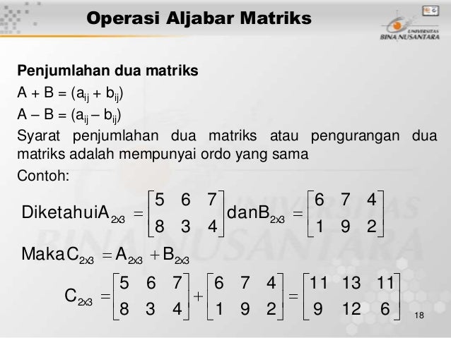 Contoh Soal Matriks from reader012.docslide.net Matriks merupakan susunan sekelompok bilangan didalam suatu jajaran yang berbentuk persegi panjang dan diatur berdasarkan baris dan kolom yang kemudian diletakkan antara 2 tanda kurung. Matriks baris adalah matriks yang terdiri dari satu baris. Pada video ini kita membahas sifat dasar dari matriks, yaitu jenis dan operasi matriks.